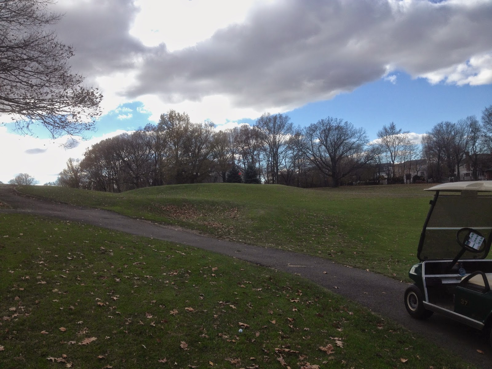 The only lost ball of the day happened right here in the middle of the 13th fairway. Bummer. It might be the first non-errant shot that I've lost to leaf piles so far this year. I put the pedal to the floor and drove the cart straight through the piles hoping to scatter them all about, but it didn't work.