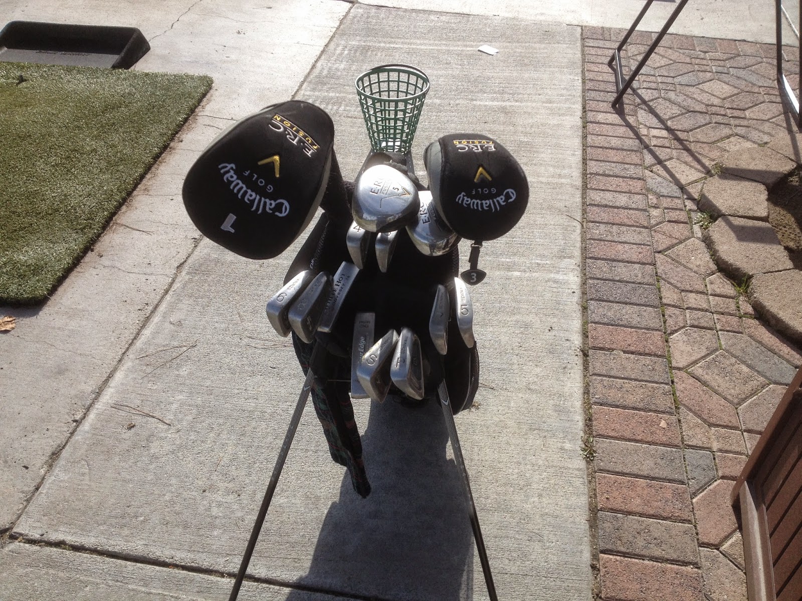 Before I head to the course, I have to ready my set for the day. Whenever I play golf out here I use a bag made up of some of my dad's old clubs. It sits in the attic save for my visits. It's got a matching set of Callaway woods: 1, 3, 5, and 7! They are softer flex than I'm used to, and not quite as long, but hey--golf is not all about distance! Besides, when do you even see a 7-wood anymore? I think that's cool, and something different from what I'm used to, so I'll try to be excited about using it.