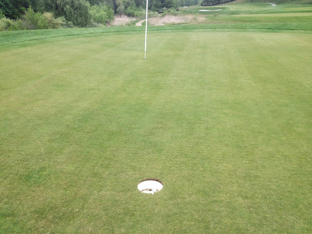 Nevertheless, Cascades is a nice set of holes. Plenty of length, sufficient room for misses, some sophisticated looking green complexes and enough challenge to keep things interesting. I had a middling first nine. Ms. L's was rather disappointing by her own standards. We both swore to shoot a better score on the second loop around, which made for a fun challenge, and we agreed there was nothing boring or repetitive about going round a second time. True to my prediction, I had a much better back nine score of 39, to make up an 82 total, which should good for my current pre-teen handicap index.