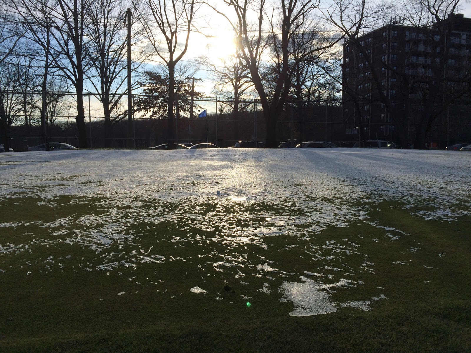 Okay, here's a birdie putt on the 2nd hole. This is where it gets interesting. Since I've always believed that winter rules are totally gay and that the standard Rules of Golf are perfectly fine in all four seasons, no choice but to try and get it there. Figure out how much gas the ball needs to get across the ice and give it a go. These conditions are rare, and as such they're kind of fun to play on. Same game we always love but with an added dimension. Of course none of that philosophical crap meant much to me after four-putting.